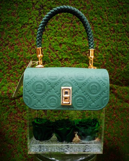 Elegante Borsetta in plexiglass e simil pelle con rose stabilizzate in acqua-gel.